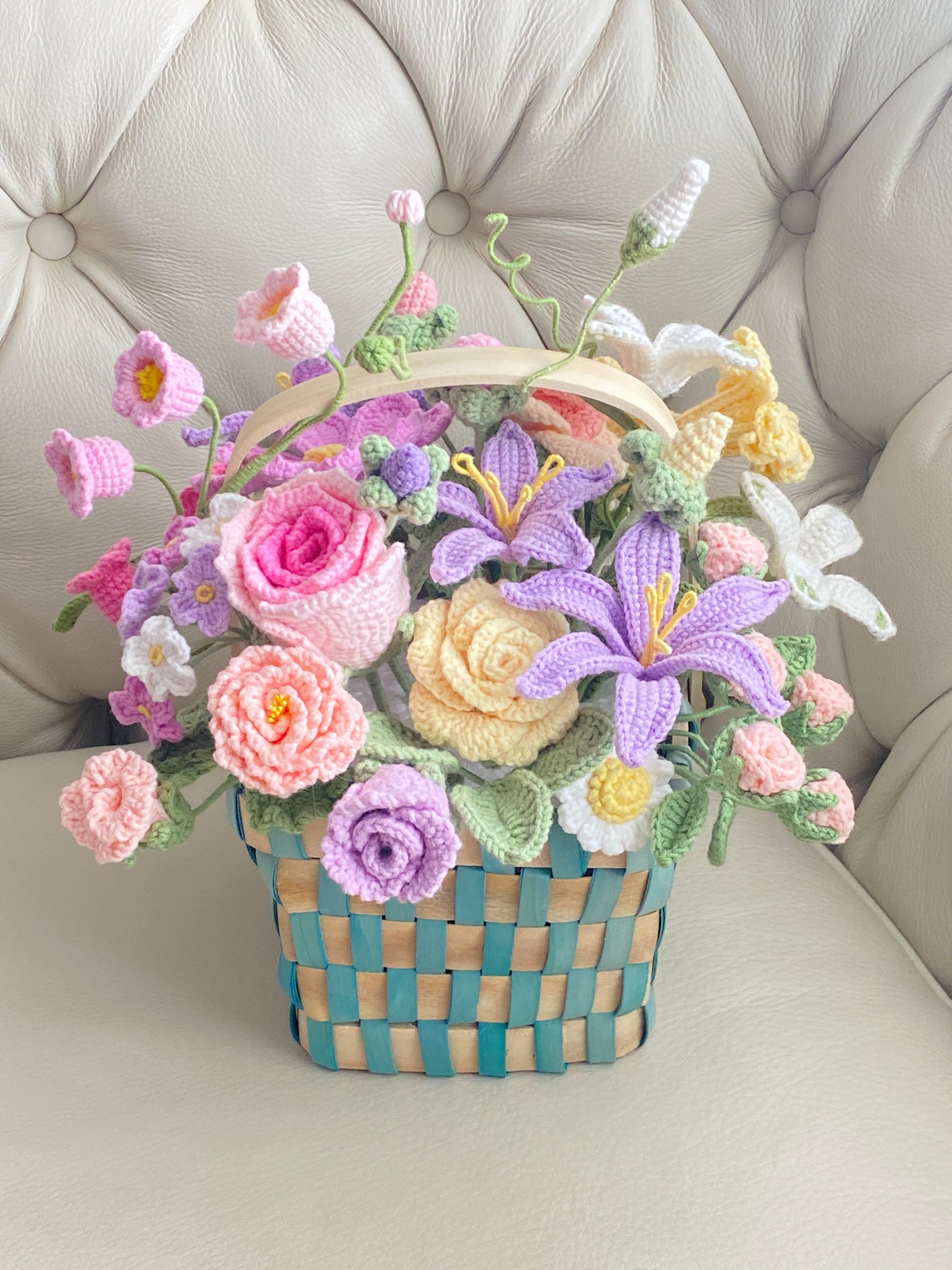 This charming handcrafted basket overflows with an enchanting collection of crocheted flowers, creating a stunning display piece that captures the warmth and joy of a garden in full bloom. Each flower is lovingly hand-crocheted by skilled artisans, nestled perfectly in a beautifully woven basket.